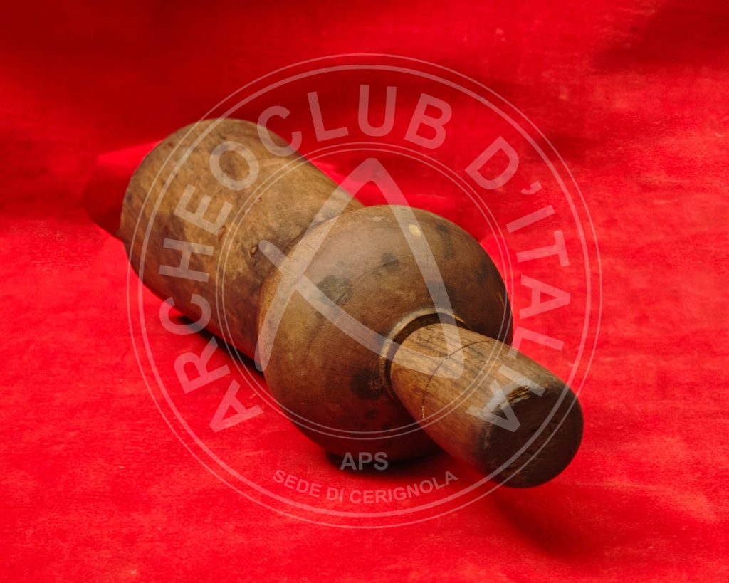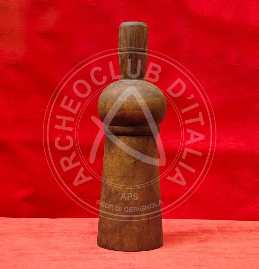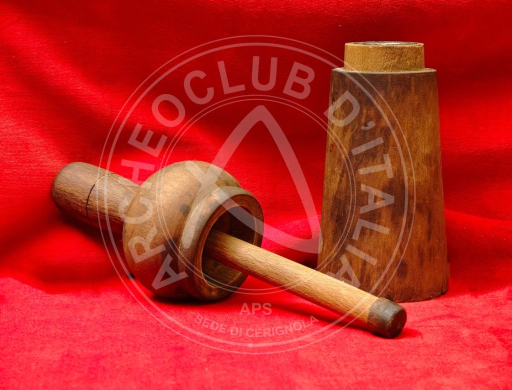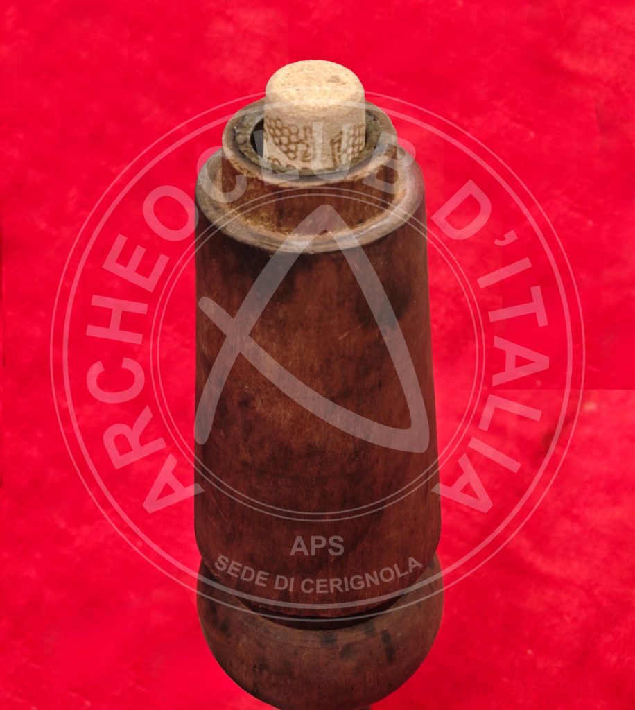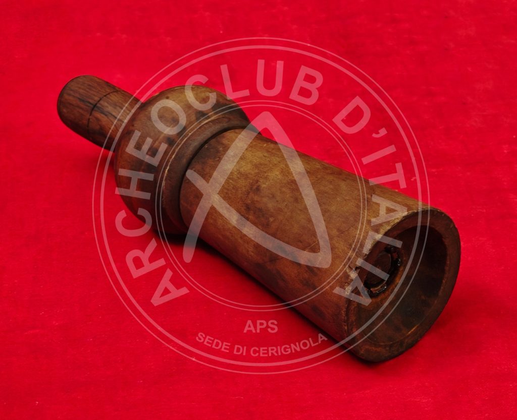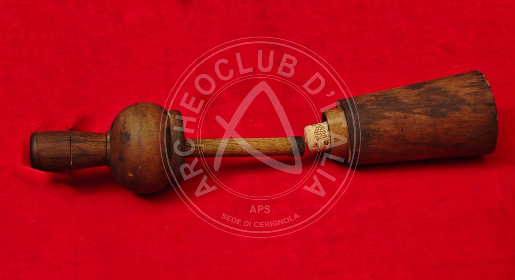 – il PISTONE di legno terminante con un anello a fascia larga di metallo atto a proteggerlo, mentre la parte superiore reca all’estremità un pomolo di legno appena schiacciato. Il suddetto pistone, attraversante la parte centrale, forma un tutt’uno con l’elemento ligneo esterno che lo contiene;