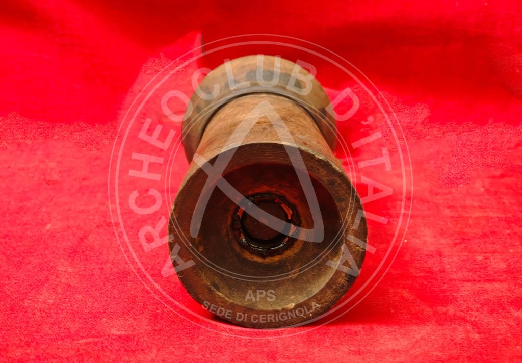 – l’altro elemento ligneo sottostante sul quale si inserisce il primo, costituente la parte più estesa in lunghezza, reca nell’interno un CILINDRO METALLICO che costituisce la parte centrale, la cosiddetta “anima” nel quale scivola il pistone ligneo.