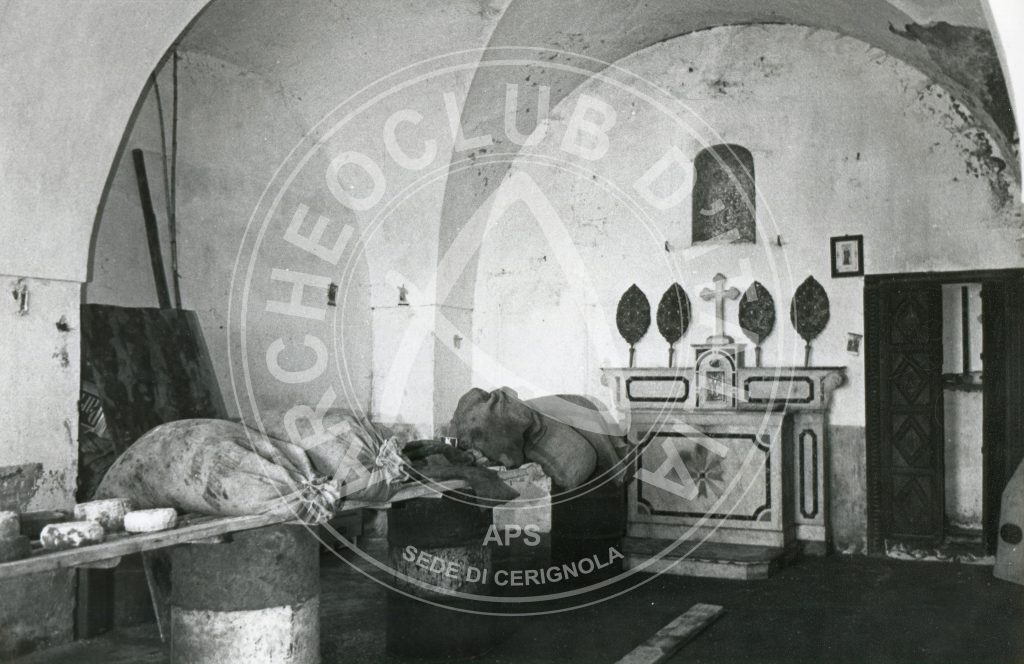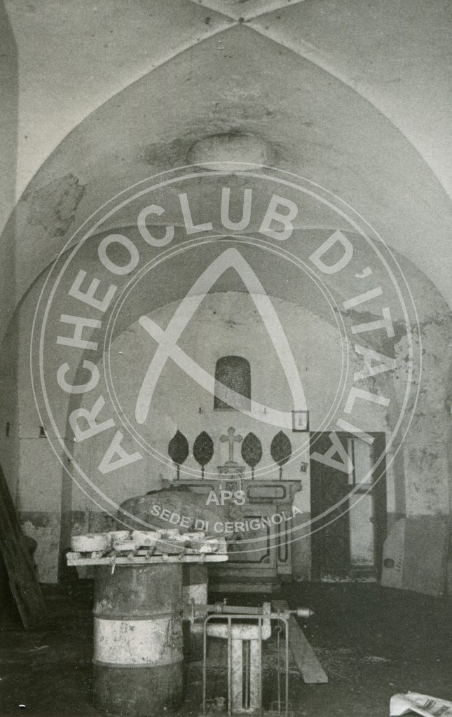 L’INTERNO, molto AMPIO, risultava essere in buone condizioni. Lo utilizzavano come magazzino.Unambiente pervaso dal riflettente BIANCO di CALCE come un GUSCIO d’UOVO. Un unico vasto spazio ovvero una NAVATA, caratteristica delle nostre belle CHIESE CAMPESTRI che ispiravano RACCOGLIMENTO, PREGHIERA, MEDITAZIONE ai numerosi abitanti cerignolani che vivevano da più generazioni e ai migranti, venuti da paesi più distanti, che vivevano nelle MASSERIE da CAMPO, CASOLARI per svolgere le numerose mansioni dedite all’agricoltura. Due AMPIE e IMPONENTI CAMPATE articolano l’interno originantesi da SEI SOLIDI PILASTRI, in muratura, TRE sulla destra e tre sulla sinistra. I pilastri costituiscono le BASI delle due VOLTE, sempre in muratura, costituite, a loro volta, da QUATTRO PERFETTE VELE, per ogni CAMPATA. È uno SPETTACOLO che affascina per la PERFEZIONE d’insieme. Nella prima CAMPATA, appena varcato l’ingresso, nella prima VELA della VOLTA notiamo un POZZO LUCE nella muratura, di forma circolare, avente doppia funzione: dare luce all’interno e dare passaggio alla FUNE atta a suonare la CAMPANA. Sulla stessa parte, varcato l’ingresso, nella zona superiore vi è l’ampia finestra con il suo telaio e ante in LEGNO. Inoltre, sulla stessa parete sono murate, sia a destra che a sinistra, due ACQUASANTIERE in PIETRA compatta di TRANI, una per parte. Proseguendo, seguiamo la parete di DESTRA, nella prima campata. Al centro si nota una TOMPAGNATURA molto ampia in muratura, molto estesa, ad interessare quasi tutta la parete. I proprietari, che mi hanno dato la possibilità di entrare in Chiesa ed effettuare le fotografie, mi raccontarono, sostando proprio davanti alla suddetta tompagnatura, essendo loro venuti a conoscenza, che ivi era una TOMBA a muro e che, a causa della insistita forte umidità, tutta la struttura muraria della medesima tomba era collassata, cadendo rovinosamente sul pavimento. La lapide ebbe a frantumarsi, la struttura. in muratura, cadde rovinosamente unitamente alla bara con l’inumato e un antico fucile. Fu subito ripristinata la muratura, corrispondente all’attuale tompagnatura come è possibile vedere dalla foto . Purtroppo, non seppero dirmi altro sulle generalità del defunto e se vi era una iscrizione, uno stemma e, forse, a rilievo, una erma in marmo del personaggio.