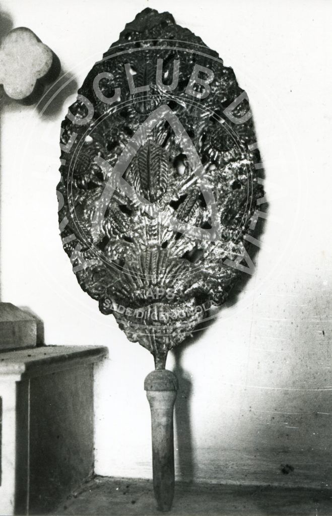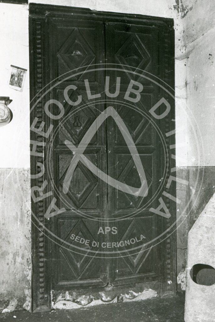 La parete dove è murato l’ALTARE vi sono due grandi aperture nella muratura: due STIPI, appunto a MURO. Per chi guarda, quello a sinistra, risulta murato; quello a destra superstite, simmetrico al precedente. Questi due STIPI a MURO servivano per riporre tutto l’arredo sacro, penso in uno per le PIANETE, CASULE, PIAVIALI, CAMICI ed altri paramenti sacri, nonché tovaglie; nell’altro gli oggetti sacri per la Messa e funzioni religiose, oltre che gli arredi per l’ALTARE: CARTA GLORIA, LEGGIO, CANDELIERI, FRASCHE, INCENSIERE, NAVETTA, CALICI, PISSIDE, PORTAOSTIE, MESSALI, VANGELO, piccolo CAMPANELLO ed altro. Sempre restando sullo STIPO superstite una artistica porta lignea lo chiude. L’ampia porta lignea di MOGANO, la considero di pregio. Presenta una bella CORNICE molto spessa, lavorata in un FASCIA che reca la parte esterna polimodanata, nell’interno una fascia ben lavorata a punte di diamante. Le due ANTE ricalcano la decorazione con una CORNICE a rilievo polimodanata la quale circonda ben QUATTRO PANNELLI, per ANTA, posti in VERTICALE, a loro volta ogni PANNELLO risulta realizzato da quattro elementi lignei, a loro volta sopra questi, recano giustapposi sopra come elemento decorativo a rilievo, a motivo geometrico, il ROMBO avente il diametro maggiore in VERTICALE e in ASSE tra di loro. Tutto ciò che costituisce il fondo delle ANTE nei suoi PANNELLI, risulta decorato con la tecnica della IMPIALLACCIATURA. I sottilissimi fogli di legno pregiato, il MOGANO color marrone scuro, venivano accostati fra di loro e volutamente orientati in modo tale che le VENATURE, parallele fra di loro, venivano a realizzare il DISEGNO a ROMBO, disponendo le NERVATURE LIGNEE più chiare e più scure in modo alterno.