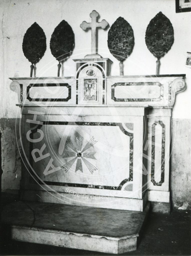 In fondo all’ampia NAVATA vi è l’unico ALTARE realizzato in MARMO policromo. A mio avviso, ritengo che doveva esserci un precedente altare, forse in legno dorato e dipinto o in pietra tenera del GARGANO, come riscontrato in altre Chiese campestri del nostro agro ad esempio: contrada CERINA nella Chiesa San Michele Arcangelo; contrada “LE TORRI DUCALI”, la Chiesa di San Casimiro Re, ed altre. L’ALTARE, nel suo STILE rimanda come datazione alla fine ottocento ed è riscontrabile in alcune nostre Chiese urbane. La PREDELLA in marmo grigio venato, realizzata in una unica lastra. Il PALIOTTO presenta una decorazione ad intarsio marmoreo policromo geometrico. Al centro una CROCE, realizzata ad intarsio, dal centro originano quattro fasci di raggi, incisi nel marmo, per parte, più lunghi dei bracci della CROCE stessa. I due CANTONALI ripropongono il motivo geometrico ad intarsio di tutto l’altare. Nella parte superiore vi è la MENSA, mentre posteriormente ad essa vi è l’unico REGISTRO abbastanza largo in altezza, sul fronte ripete la decorazione geometrica ad intarsio marmoreo e termina sia a destra che a sinistra con la BELLA VOLUTA CAPIALTARE. Al centro del REGISTRO vi è il CIBORIO dove si ripete, su di esso, la decorazione geometrica ad intarsio. La PORTICINA, in metallo evidenzia il CALICE a sbalzo. Sovrasta il CIBORIO una CROCE in marmo grigio venato. Inoltre su l’unico REGISTRO vi sono quattro PALME (più conosciute come “FRASCHE”) in lamierino lavorato a SBALZO a giorno, due per lato al CIBORIO. Le QUATTRO PALME METALLICHE, uguali, realizzate con il medesimo STAMPO, presentano una ricca serie di FOGLIE composite, enormi ed espanse, grandi FIORI a capolino delle COMPOSITE come i grandi girasoli. Nel passato gli altari venivano adornati, posti sui registri, con FRASCHE che potevano essere realizzate in metallo, come abbiamo scritto o in porcellana con fiori e foglie, più artistiche e costose in corallo, inoltre sul REGISTRO dovevano esserci i CANDELIERI, ma anche RELIQUIARI. Ancora, le quattro PALME METALLICHE terminano con un prolungamento in legno, che funge da peduncolo molto allungato che andava ad inserirsi in un PORTA FRASCHE, anfora metallica, pesante a due ANSE, generalmente dorate.
