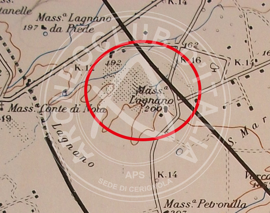 Giovanna Alvisi, nella sua pubblicazione “La viabilità romana della Daunia” (1), in particolare, nel III capitolo “Vie individuate con l’aerofotografia”, tra le altre, prendendo in considerazione la “Herdoniae (f.175)”, scrive che: “[…]Tre sono i collegamenti meglio individuabili …. Le tre strade ricalcano, evidentemente, tracciati molto antichi; infatti, sia lungo il percorso di queste che nelle zone circostanti, la concentrazione di villaggi preistorici appare straordinariamente alta anche sulle aerofografie del 1954, che, come abbiamo più volte osservato, conservano solo una parte delle tracce rilevabili fino a dieci anni prima. Insieme a queste testimonianze di vita preistorica il tratto di pianura compreso tra la città di Ordona e l’Ofanto è ricco di una serie di anomalie riferibili a resti di età romana. Segnaliamo a questo proposito, lungo il primo tracciato…; per il secondo: Masseria Lagnano ed i suoi dintorni […]”. Infatti, sul Foglio 175, la Masseria LAGNANO reca disegnata, in quasi tutto il suo perimetro, una fitta puntinatura ad indicare il SITO PREISTORICO.
