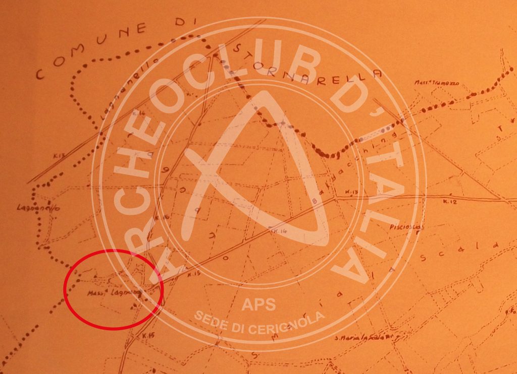 La CONTRADA “LAGNANO” rientra nell’agro di Cerignola e confina con il COMUNE di Stornarella. Dista 15 Km da Cerignola, percorrendo la “Strada Vicinale Torricelli – Lagnano” a partire dalla contrada “TOMBA DEI GALLI” e, a seguire, “TORRICELLI”, “TRE PERAZZI”, “BALDACCHINO”, fino alla Contrada “LAGNANO”, fermandosi alla “MASSERIA LAGNANO” e dopo “LAGNANELLO”. I riferimenti sono ricavati, oltre che dal “FOGLIO 175 – CERIGNOLA”, anche dal “COMUNE /DI / CERIGNOLA /PLANIMETRIA GENERALE / DEL / TERRITORIO – / SCALA 1:2500” (fotocopia anni ’70) e da “COMUNE / DI / CERIGNOLA – PLANIMETRIA GENERALE / DEL / TERRITORIO / SCALA 1:50.000” (fotocopia anni ’70) e “F°. 175 della Carta d’Italia – BORGO LIBERTA’ ” – Istituto geografico militare – Rilievo del 1954” (5).