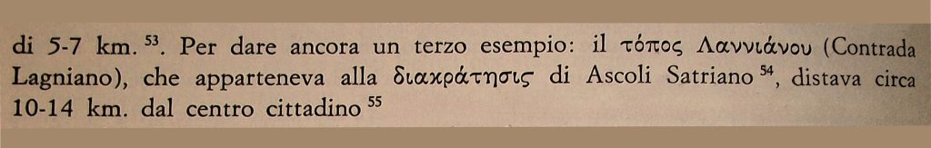 Il TOPONIMO cheindica l’antichissima contrada “LAGNANO” ha una radice greca del periodo BIZANTINO, infatti, nel II Capitolo “Città e costituzione cittadina – 1 La Struttura della città” della pubblicazione di Vera Von Falkenhausen (4) leggiamo: “[…] Per dare ancora un esempio: il TOPOS LANNIANU (Contrada Lagnano), che apparteneva alla DIACRATESIS di Ascoli Satriano (nota) 54, distava circa 10-14 Km. dal centro cittadino (nota) 55 […]”.