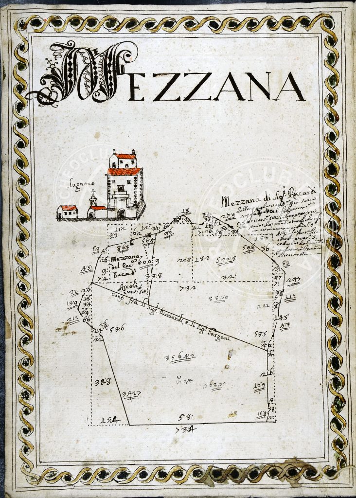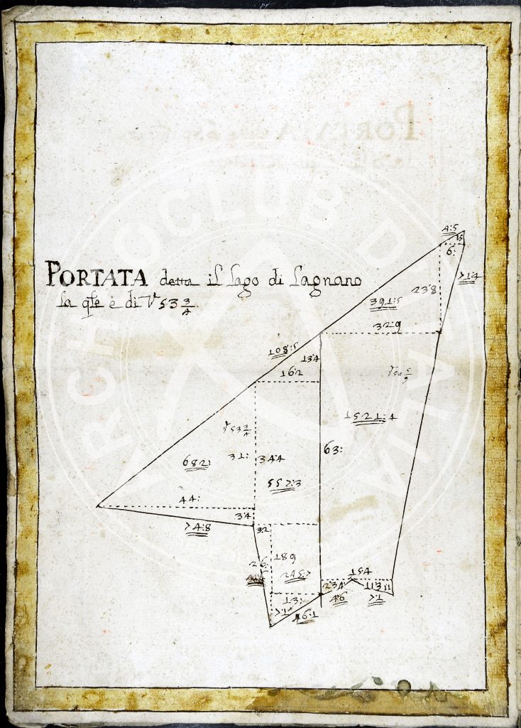 “PIANTE / DELLA PORTATA DI LAGNANO / appartenente all’Ill.a Casa delli Sig.ri Ricciardi di Santo / Angelo Lombardo compassata dà me Croce Zannetti / Reg.o Agrimensore in q.sto cor.te Anno 1754 d’Ordine del / Sig.r D.r: D:no Nicola Ricciardi patrone del Feudo di / Lagnanello”.