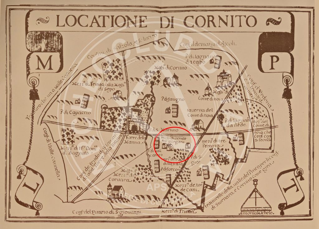 Nel 1686,viene espressamente menzionata, sia come toponimo che graficamente, in modo molto schematico, nella “LOCATIONE DI CORNITO”, in tal modo: “Mass.a di Donat’Ant.o Gargaro” (7), ulteriore proprietario. Sappiamo che la suddetta MASSERIA, nel 1742, apparteneva al nobile Donato Antonio Gargano, vivente. Tanto viene desunto dal CATASTO ONCIARIO di Cerignola del 1742, custodito nell’ARCHIVIO DI STATO DI NAPOLI. Infatti, tra i “Possessori Esteri Laici”, ritroviamo la seguente SCHEDA che riportiamo pubblicandola integralmente per la prima volta (8): “L’attuali Mag(nific)i Governanti di questa Terra vedendo che il Mag(nific)o Do(mi)no Antonio Gargano della Terra di Bagnoli doppò essere stato notificato, né a’ curato sin’ora a’ tenere d(e)lle Reali , Istruz(ion)i p(er) il G(eneral(e) Catasto presentare La sua rivela in Loro potere di tutti li beni che possiede nelli tenimenti di questa Terra; p(er)ciò li med(esim)i p(er) la diligenza fatta; anno appurato possedere li seg(uent)i beni. Una Massaria, chiamata di Lagnano in tenim(ent)o di questa Terra nella quale vi sono Carra trè, e mezzo di Mezzana con diloro Portata, co(n) esservi ancora la Panatteria, Taverna, Orto e Casamenti, dalla quale Massaria come sopra Panat(teri)a, Taverna, ed’Orto, come so(pr)a ne può Recavare annui La somma di d(ocat)i trecento cinquanta, così appurato da Mag(nifi)ci Governanti, e Deputati, che sono – onc(e) n° 1166:20”.