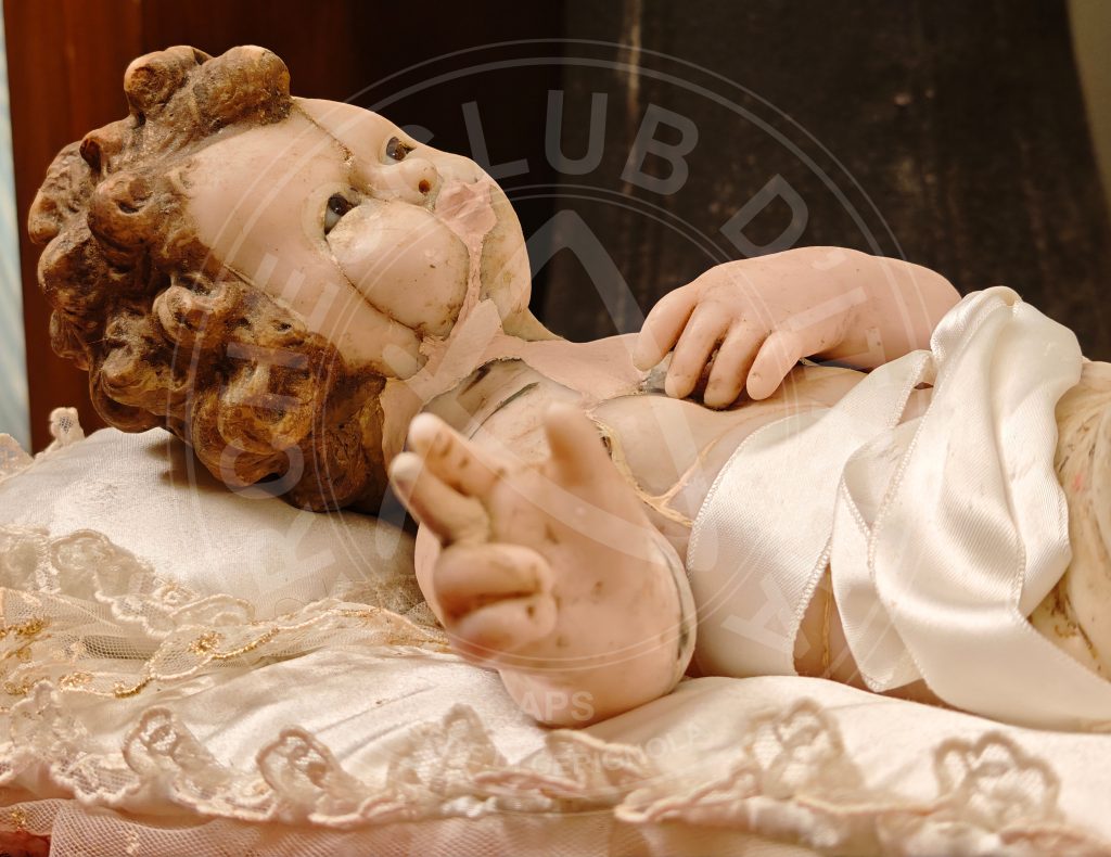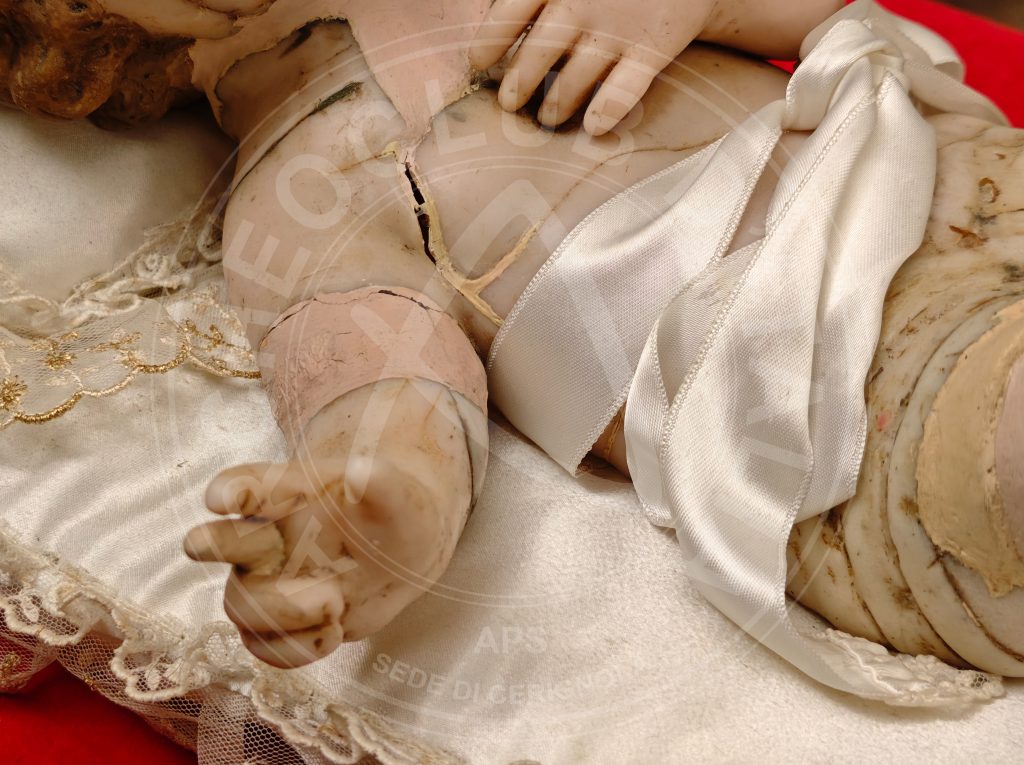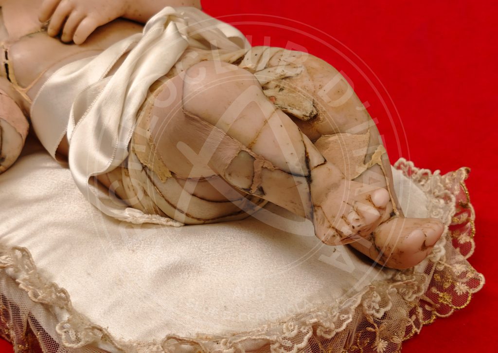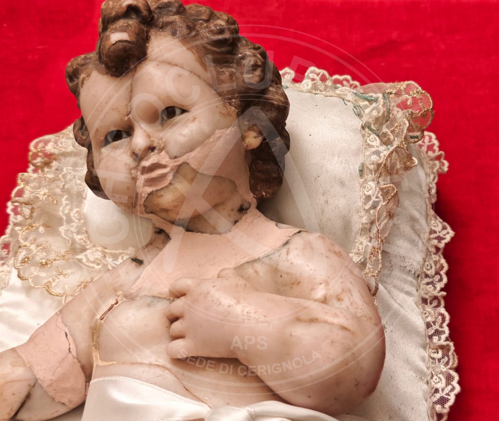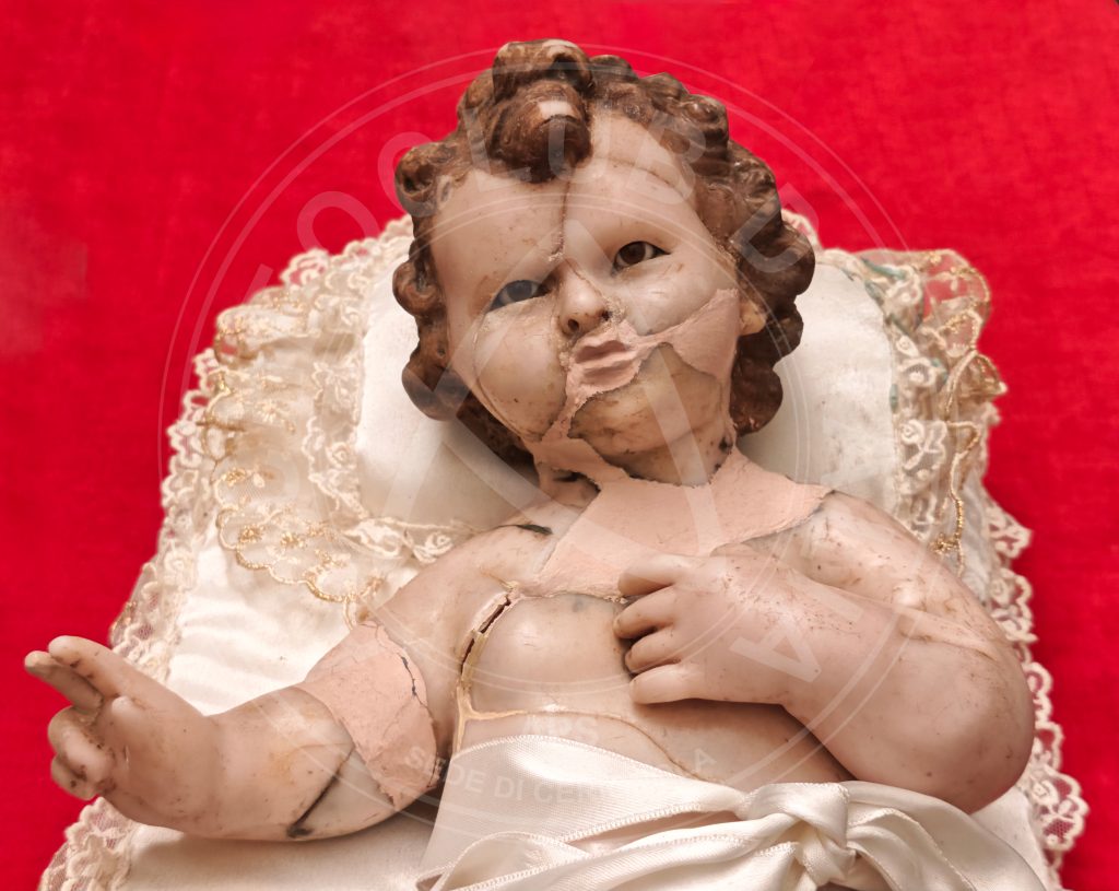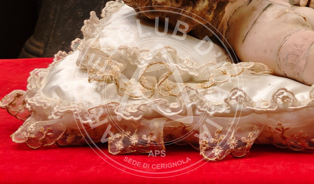 Per la bella statua del Gesù Bambino è stato confezionato dalla signora Ida Avello, madre del giovane Divito, un pregevole cuscino in raso bianco arricchito perimetralmente da una doppia fila di merletto bianco e oro. Un intervento di salvataggio di un’opera “minore” che certamente tanta storia ha da raccontare senz’altro parte di una campana di vetro che, per motivi che non conosciamo, è andata perduta come rischiava anche la statua dopo quel mal riuscito intervento di restauro” (4).