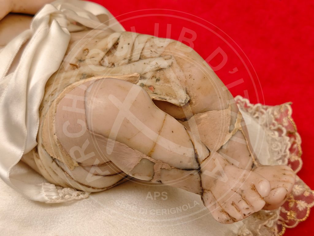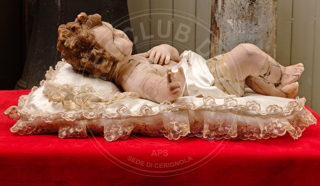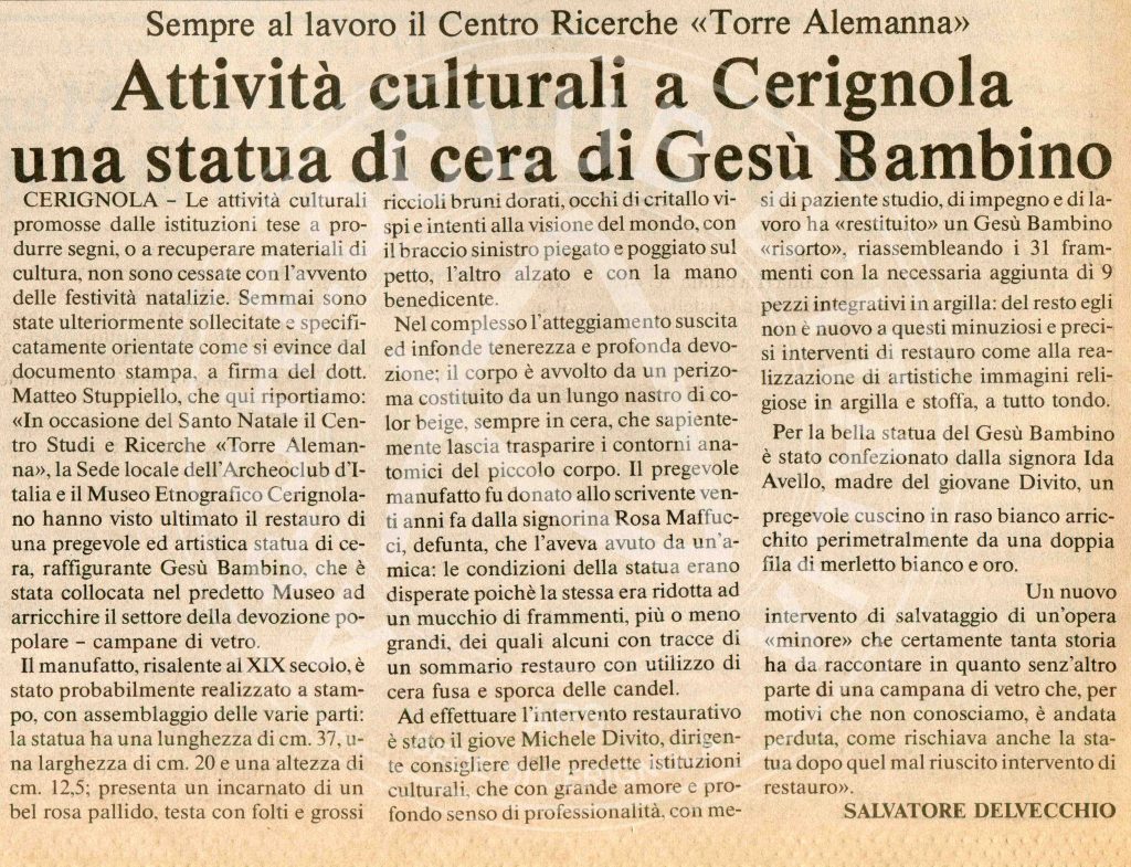 Riporto l’artico: “In occasione del Santo Natale il Centro Studi e Ricerche “Torre Alemanna”, la Sede dell’Archeoclub d’Italia e il Museo Etnografico Cerignolano hanno visto ultimato il restauro di una pregevole ed artistica statua di cera, raffigurante Gesù Bambino, che è stata collocata nel predetto Museo, ad arricchire il settore della devozione popolare – campane di vetro.
